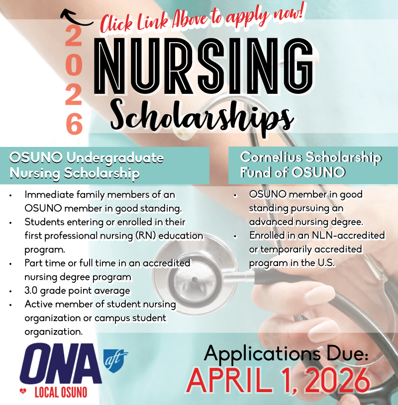 In addition to the above OSUNO Scholarships, please see the below nursing scholarships, most with the due date of March 1, 2025. Click on the scholarship names to read more about the scholarship and click here to apply for the below scholarships.